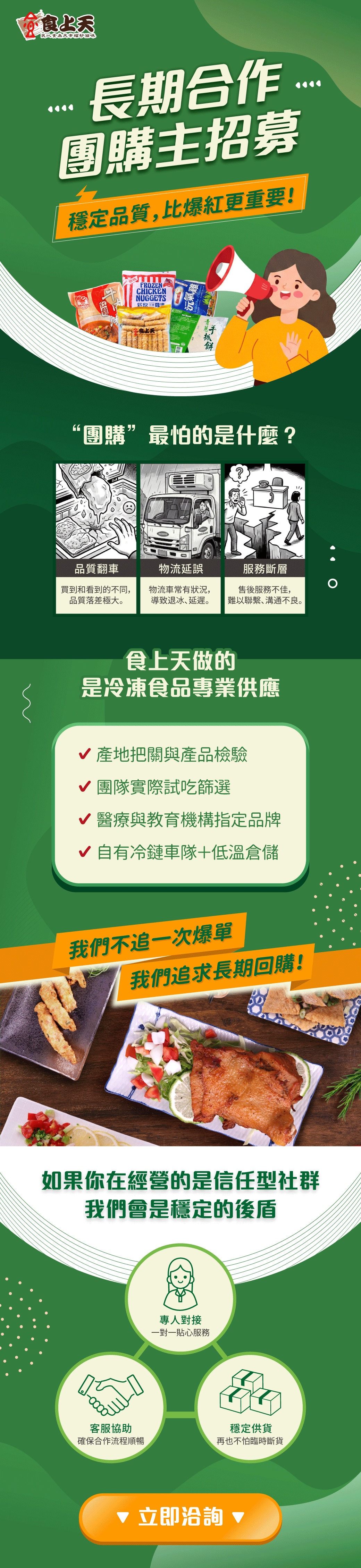 請加入食上天官方Line,並留言以下資料,將由專員為您服務1.社團/平台名稱: 2.主客群年齡區間:18-25 / 26-34 / 35-44 / 45以上 3.成員人數: 4.聯絡人姓名: 5.聯絡人電話: 6.想優先合作的商品類型: