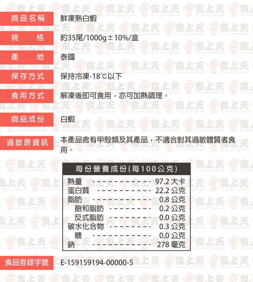 商品詳情 料理方式:解凍即食、冷盤、熱炒食譜分享:啤酒蝦 【商品特色】現撈的品質,冷凍的便利! 時下熱門選擇,解凍即食,便利生活,輕鬆享用😍 🦐現撈起來的白蝦,烹調熟成即立馬使用「急速冷凍」保留著白蝦的每一處精華! 不論是鮮甜的風味還是彈牙的肉質,都沒有因為是冷凍而打折扣👍🏻 食上天幫你處理好的白蝦,讓你在烹調上輕鬆不瞎忙😜 ✔️糖醋 ✔️熱炒 ✔️清蒸 ✔️煲湯 ✔️串烤 ✔️涼拌 樣樣輕鬆,樣樣快速! 成為總鋪師,熟白蝦是你貼心的好朋友💪🏻 【商品規格】 鮮凍熟白蝦(4/5) TWD $499 TWD$ 499