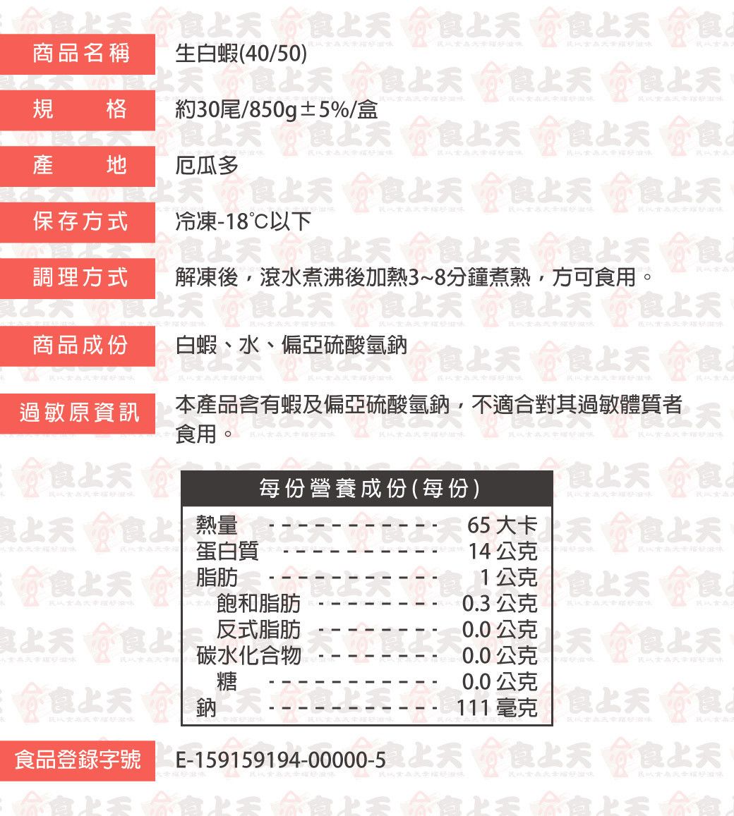 商品詳情 《生鮮》料理方式:熱炒、清蒸、鹽焗、燒烤適用人數:8-10人食譜分享:鹽焗大蝦 【商品特色】在純淨養殖環境長大的鮮嫩白蝦 肉質頂尖不用說,飽滿結實是鮮蝦基本條件👍🏻 ✨清蒸乾煎鹽焗都涮嘴,節慶送禮最大氣✨ 大蝦料理一點也不難,快來食上天看看怎麼分分鐘上大菜✌️ 烹調方法🧡 #流水解凍 ✔️鹽焗:以鹽巴悶燒至熟透 ✔️清蒸:搭配蔬食/辛香料蒸煮 ✔️燒烤:直接放上烤網直接燒烤至全熟 ✔️熱炒:搭配蔬食/辛香料熱炒 【煮編上線囉🍳】 鹽焗大蝦 【商品規格】 活凍生白蝦(40/50) TWD $299 TWD$ 299