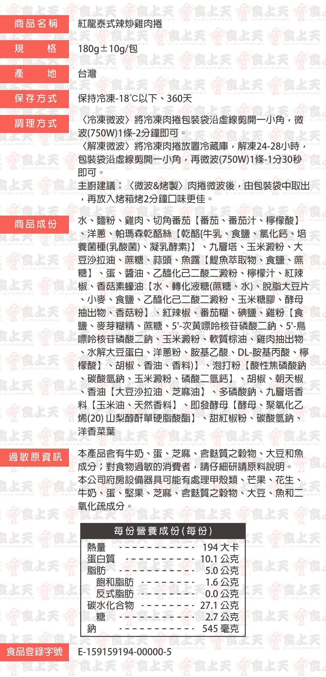 商品詳情 《熟食》料理方式:烤箱、氣炸、微波 【商品特色】🌯嚴選香Q有嚼勁的捲餅皮,包裹著鹹香辣炒雞肉,煎烤後金黃微酥,一口咬下外酥內嫩,層次分明。 雞肉條經「按摩式」前置處理,肉質更軟嫩,使其能充分吸附醬汁,口感鮮香多汁。 採用朝天椒🌶️、九層塔與番茄,加入多樣香料拌炒,香氣濃郁,酸辣平衡,尾韻清爽不膩口,完整呈現泰式辣炒的靈魂風味。 爽辣過癮 ,老饕最愛😜 外層酥香,內餡飽滿,讓人一吃就停不下來!每一口都是泰式街頭美食的濃縮版,嗜辣愛好者必嚐! 品嚐分享💛 #需解凍✔️烘烤 ✔️氣炸 ✔️微波 【商品規格】 紅龍 泰式辣炒雞肉捲 TWD $65 TWD$ 65