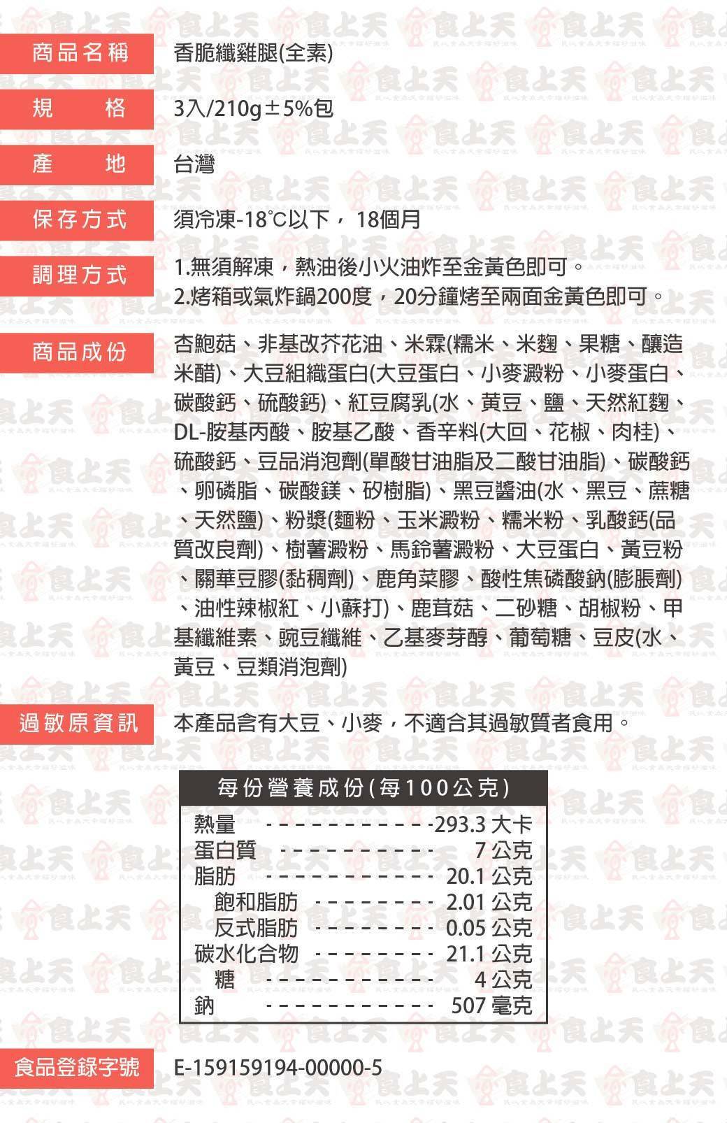 商品詳情 《全素》料理方式:覆熱即食 【商品特色】植物肉也可以咔脆到底💥 咬下去「卡滋卡滋」~外層金黃酥香,裡面是多汁杏鮑菇+植物肉,鮮甜又爆汁,根本素食界的咔啦雞!✔千層豆皮超酥,層層咬感、爆汁滿分 ✔杏鮑菇纖維+植物肉,口感超像真雞腿 ✔不用解凍,油炸、氣炸都可以馬上開吃✔早餐、宵夜、派對、追劇都超對味 全素可食,無動物成分,友善環境與飲食選擇 品嚐分享💛 #免解凍 ✔️油炸 ✔️氣炸 口感介於炸雞腿與素排之間,輕食族群的新選擇! 【商品規格】 香脆纖雞腿(全素) TWD $195 TWD $195