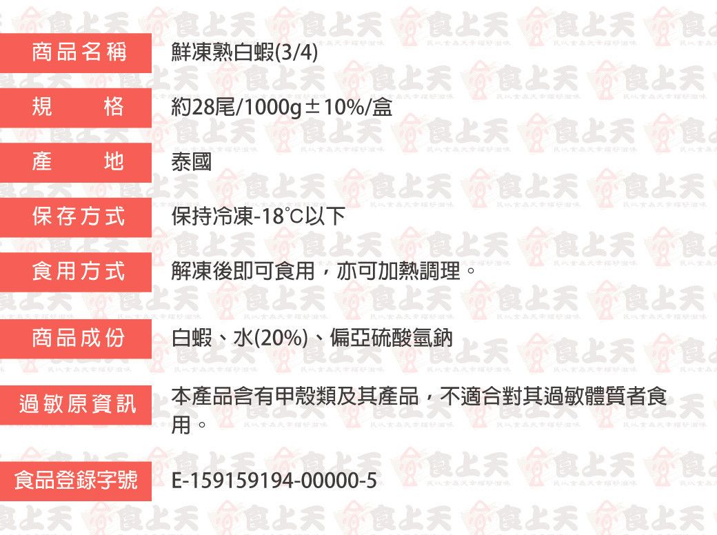 商品詳情 料理方式:解凍即食、冷盤、熱炒食譜分享:啤酒蝦 【商品特色】現撈的品質,冷凍的便利! 時下熱門選擇,解凍即食,便利生活,輕鬆享用😍 🦐現撈起來的白蝦,烹調熟成即立馬使用「急速冷凍」保留著白蝦的每一處精華! 不論是鮮甜的風味還是彈牙的肉質,都沒有因為是冷凍而打折扣👍🏻 食上天幫你處理好的白蝦,讓你在烹調上輕鬆不瞎忙😜 ✔️糖醋 ✔️熱炒 ✔️清蒸 ✔️煲湯 ✔️串烤 ✔️涼拌 樣樣輕鬆,樣樣快速! 成為總鋪師,熟白蝦是你貼心的好朋友💪🏻 【商品規格】 鮮凍熟白蝦(3/4) TWD $499 TWD $499