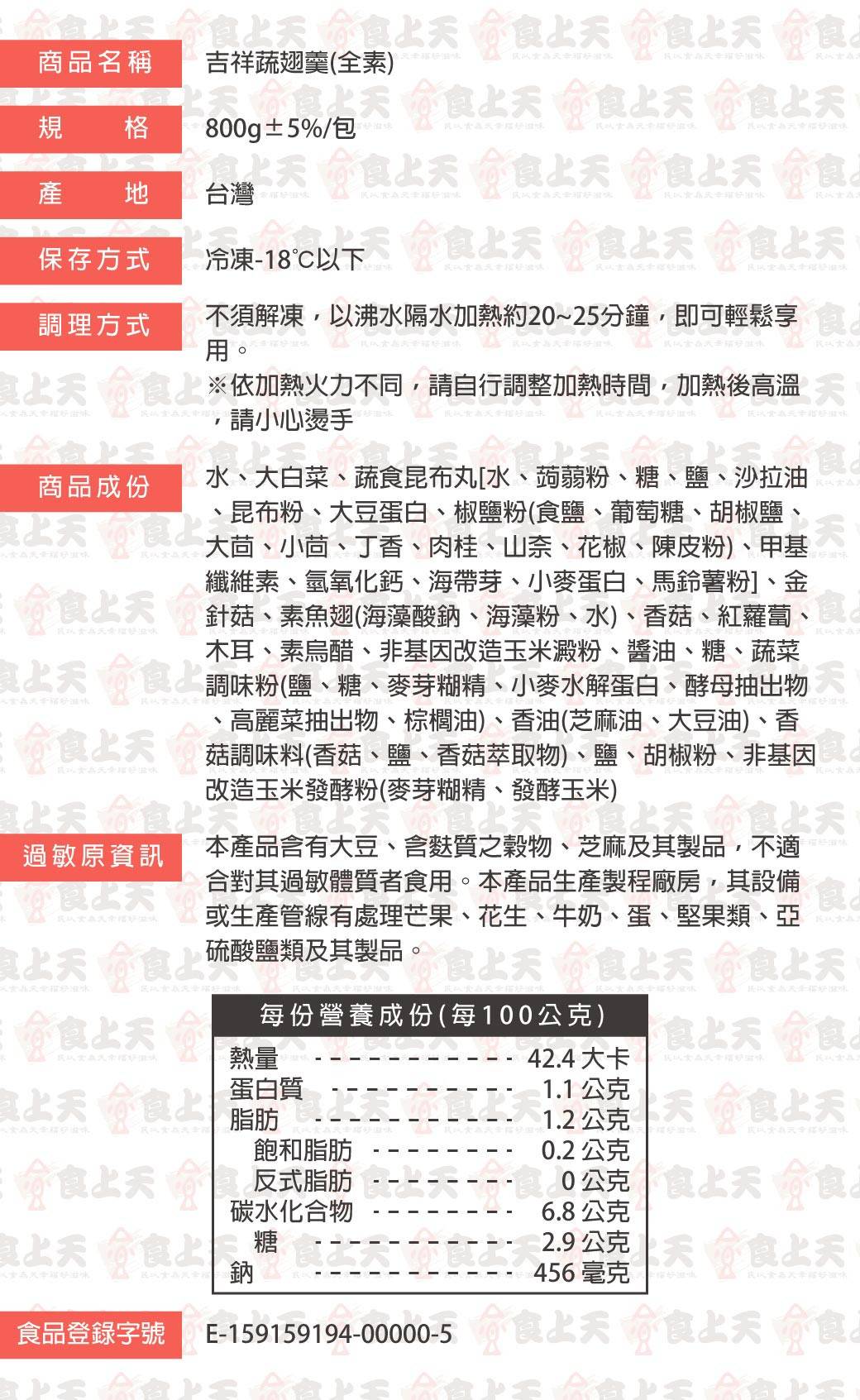 商品詳情 《全熟》《全素》料理方式:覆熱即食 【商品特色】🍲清爽暖心,一盅全家的吉祥味 嚴選多種天然蔬菜🥬細火慢熬,以植物性蔬翅取代動物性魚翅,口感柔滑、有韌度、清爽無負擔👍 加入大白菜、香菇、木耳、金針菇等豐富食材, 料多實在,每一口都能喝到清甜蔬味的精華🥣,湯頭滑順不膩、風味純粹、溫和暖胃。 簡單加熱即可享用,是年節、日常都適合的安心款羹品。全素可食,家人一起享用更安心! 象徵平安順意的暖心羹湯,讓每一餐都多一份吉祥,一份幸福💖 品嚐分享💛 #需解凍 ✔️覆熱即食(微波/電鍋/隔水加熱) 【商品規格】 吉祥蔬翅羹(全素) TWD $270 TWD $270