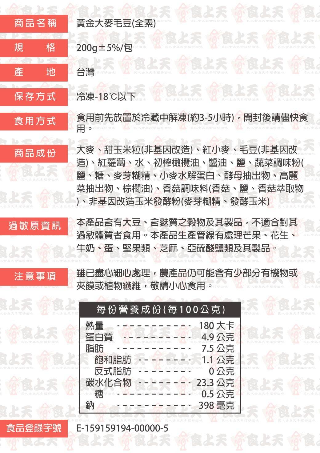商品詳情 《全熟》《全素》料理方式:復熱即食、解凍即食 【商品特色】🌱越嚼越香的健康小食 選用飽滿毛豆搭配黃金大麥、紅蘿蔔、玉米粒等,以最單純的方式調味,保留食材本身的清甜香氣,吃得到自然、吃得到放心💯 毛豆粒粒飽滿、口感Q彈;大麥清香、咀嚼後帶出淡雅穀物香,兩種食材調和成清爽又耐吃的小確幸💖無油炸、無負擔,冰冰吃更涮嘴,是下午茶、宵夜、小酌良伴的輕盈選擇。 解凍即食,✨口感層次豐富且色彩繽紛,便利又美味!吃了會想再吃的自然小點心。品嚐分享💛 #需解凍 ✔️解凍即食 【商品規格】 黃金大麥毛豆(全素) TWD $89 TWD $89