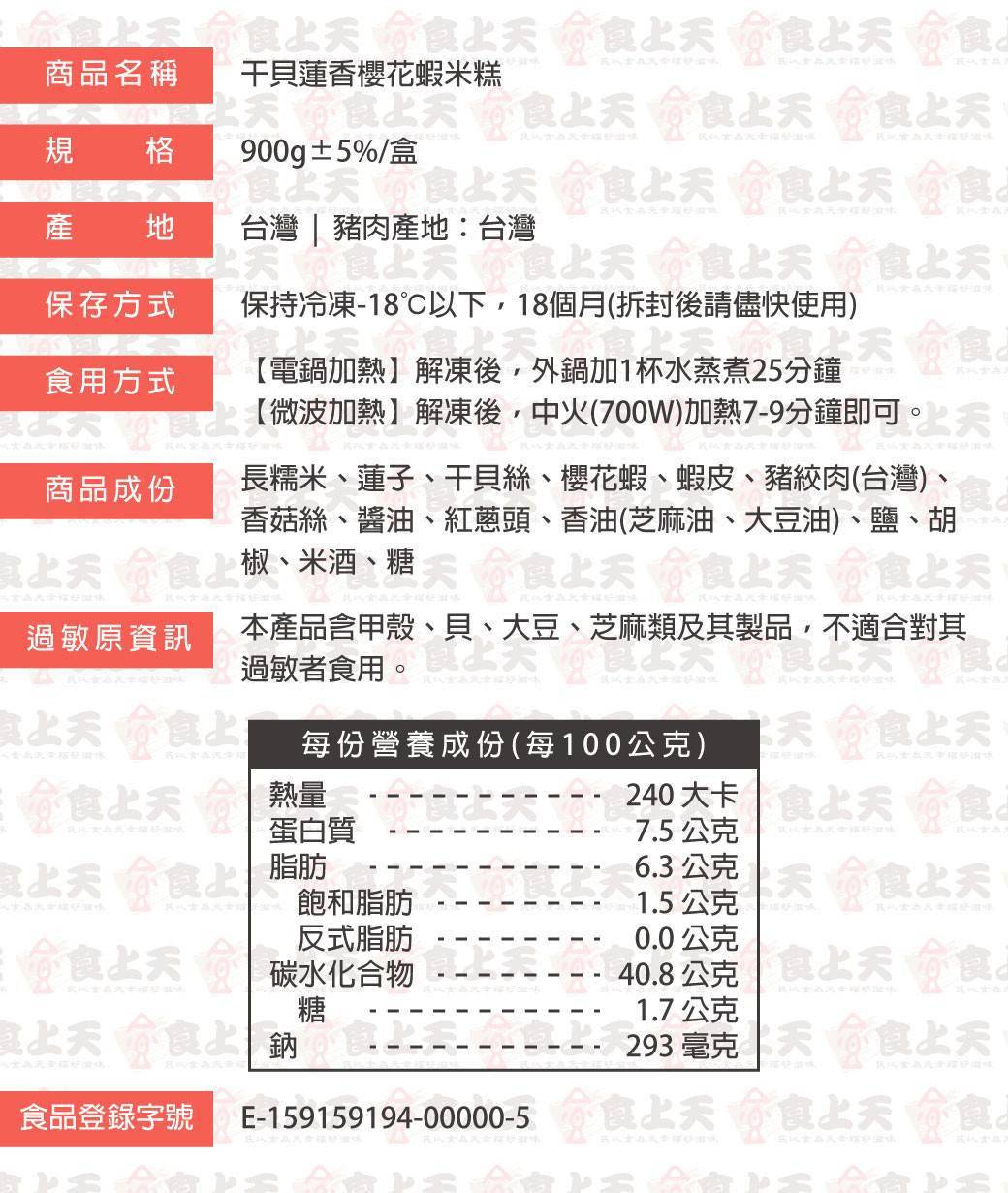 商品詳情 《熟食》《台灣豬》料理方式:復熱即食※無附上蓋 【商品特色】真正來自「東港」的櫻花蝦,配著干貝與蓮子的創意組合讓你對傳統米糕,另 眼 相 看!糯米獨家料理,軟Q濕潤的恰到好處!跟香氣十足的櫻花蝦,干貝絲絲口感分明,綿密化口的蓮子,每一口咀嚼到的多重層次,甚是享受😍你說有什麼是美食解決不了的呢?餓了,就來一碗豐盛的米糕滿足自己吧🤩品嚐分享💛✔️覆熱即食 【商品規格】 干貝蓮香櫻花蝦米糕 TWD $499 TWD $499