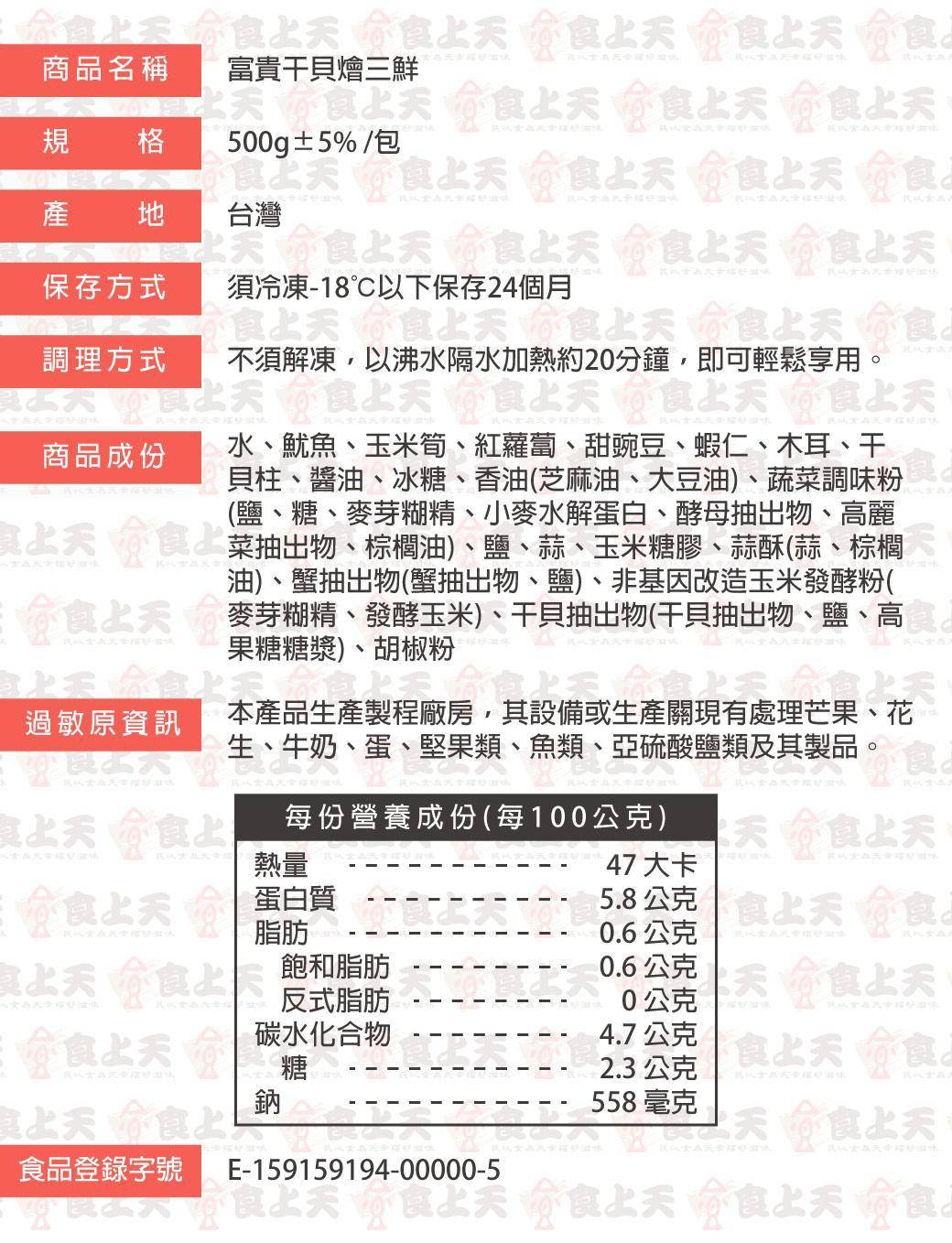 商品詳情 《熟食》料理方式:覆熱即食 【商品特色】🎊年年節桌上的富貴好彩頭,一道就撐起氣派 嚴選干貝、魷魚、蝦仁入鍋燴煮,鮮甜海味交織成濃郁醬香,再搭配玉米筍、紅蘿蔔、木耳、豆莢等豐富食材,色香味俱全、口感層次分明。 滿滿鮮味的團圓好菜,象徵著富貴吉祥,食材層層交織,口感豐富、滋味圓潤,是圍爐與宴客不可少的一道體面大菜,為新的一年添好運、迎好福。🧧 富貴寓意,年菜必備 🍱 澎湃用料,吉祥滿桌 🍲 加熱即上桌,輕鬆端出好氣派 👨👩👧👦 闔家共享,鮮香暖心,團圓更有滋味 品嚐分享💛 #需解凍 ✔️微波 ✔️隔水加熱 【商品規格】 富貴干貝燴三鮮 TWD $245 TWD $245