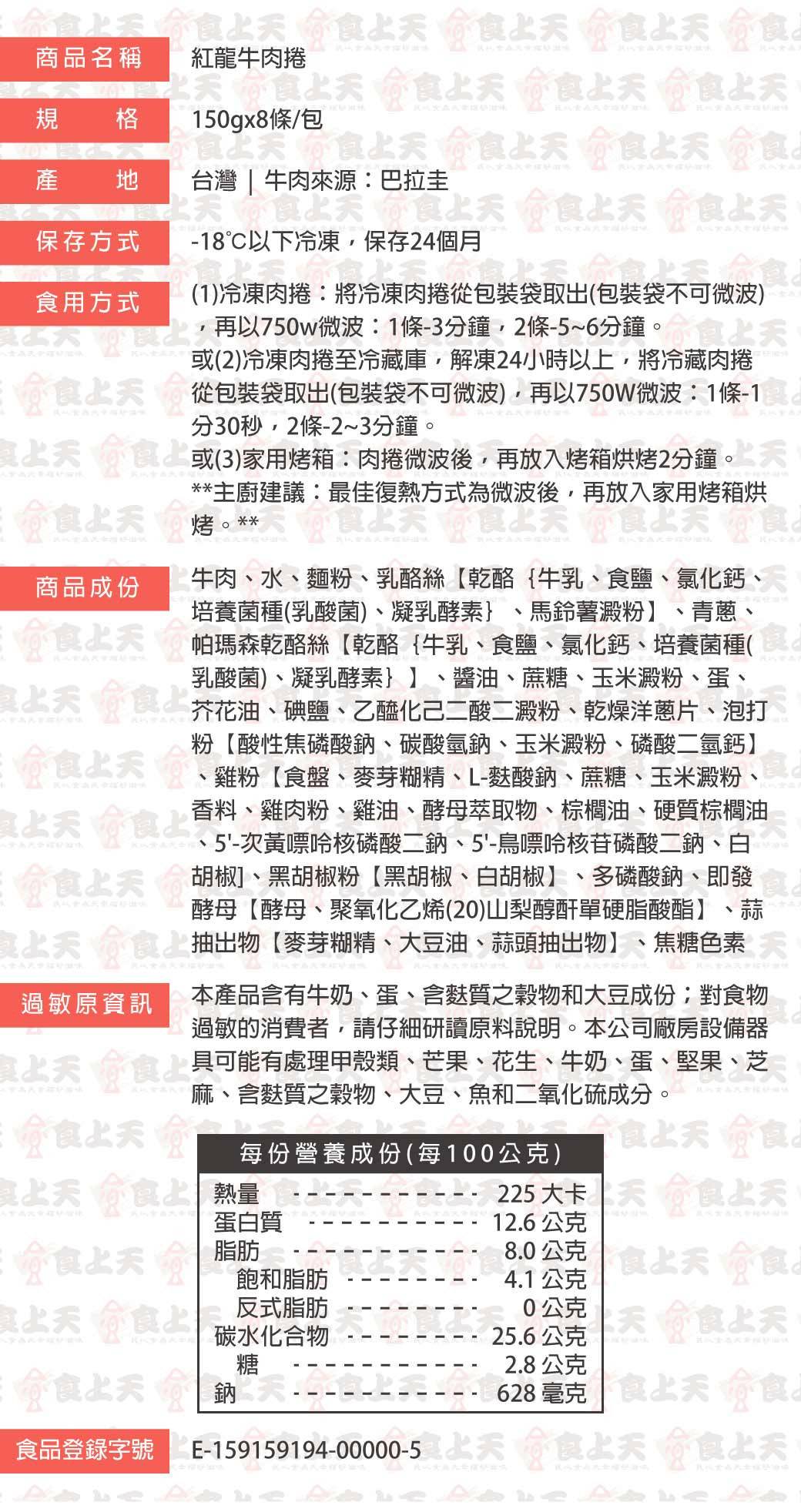 商品詳情 《熟食》料理方式:烤箱、氣炸、微波適用人數:6-8人 【商品特色】酥脆的餅皮就要搭配鮮嫩的肉🤘🏽片片牛肉使用高等級辛香料調製醬汁,濃濃的裹覆每一片牛肉,醃製並滲入肉片其中。厚薄適中的餅皮夾著豐富牛肉內餡,烘托得更加細緻和可口。豐富的口感與濃郁的香氣,讓你每一口都讚不出聲🤤品嚐分享💛 #須解凍✔️烘烤 ✔️氣炸 【商品規格】 紅龍牛肉捲 TWD $350 TWD $350